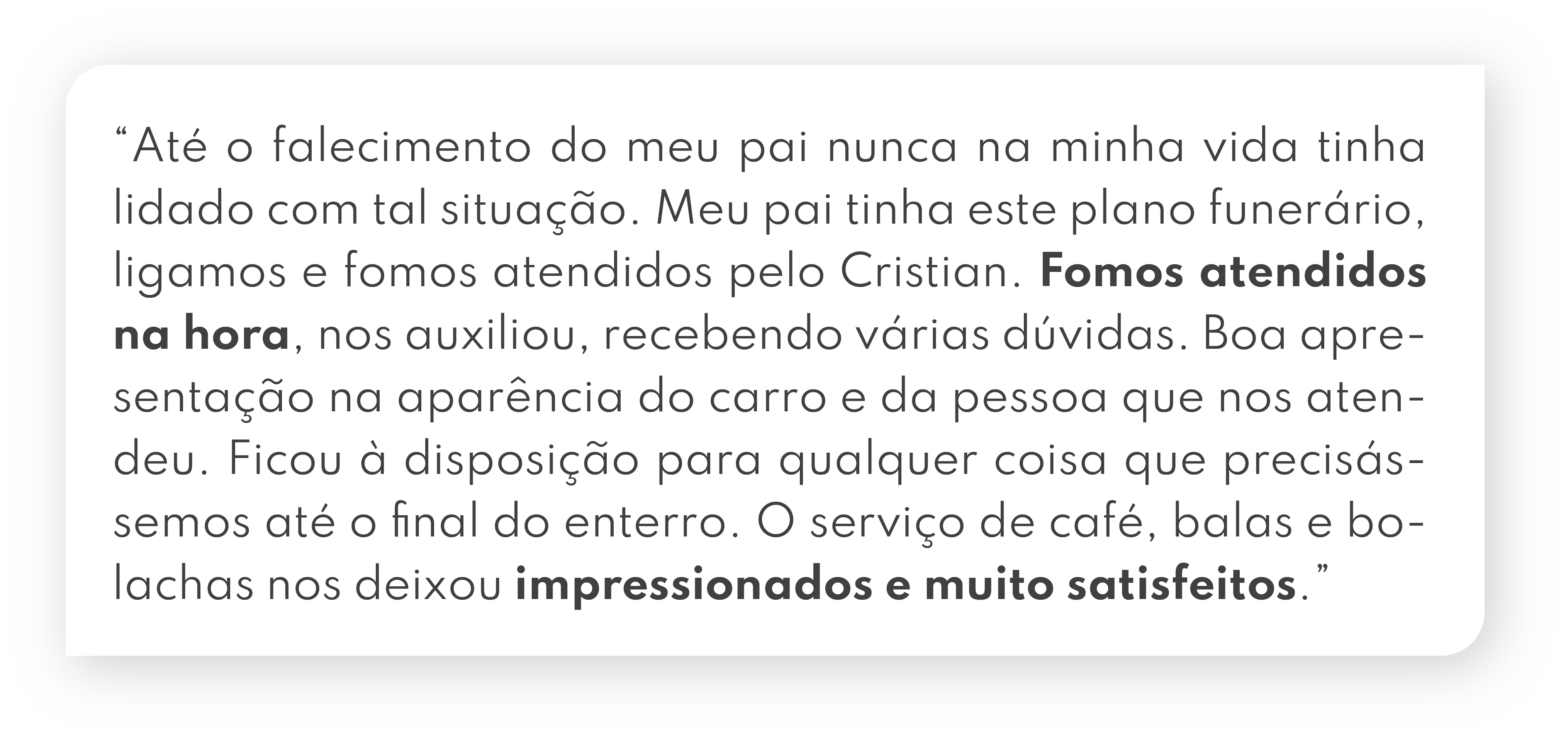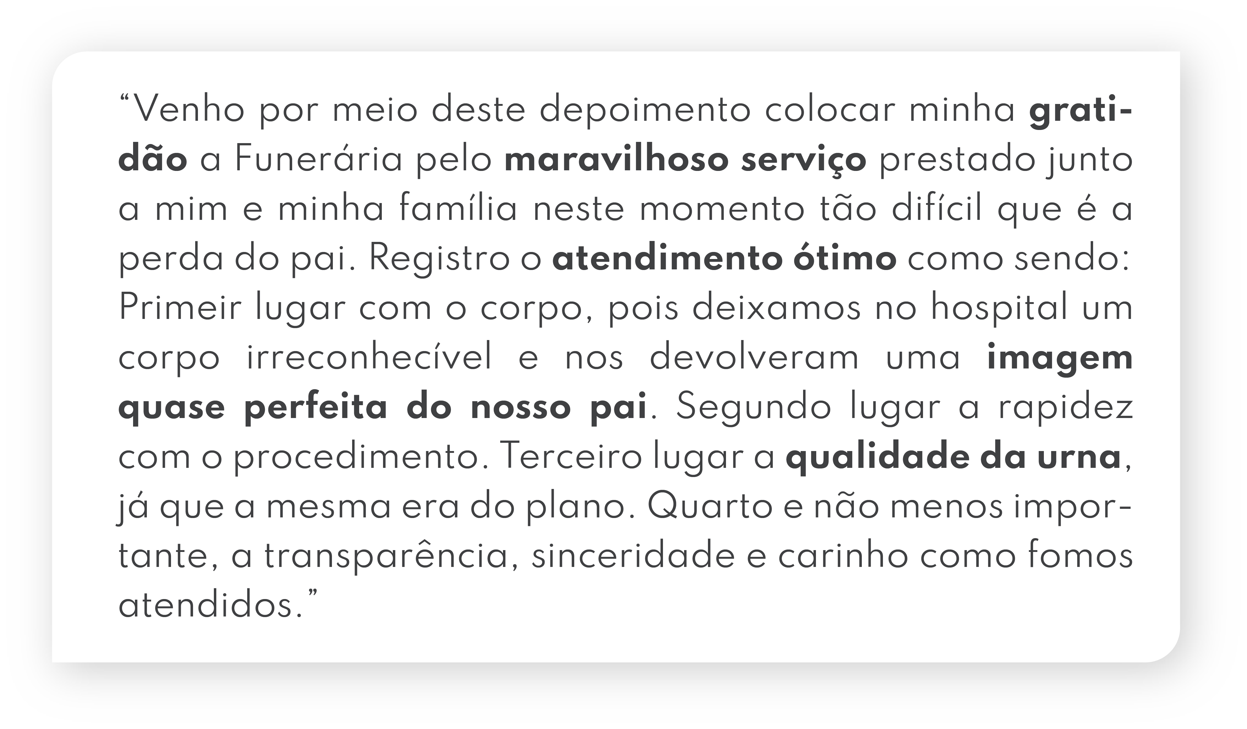 Desde 1984, prestamos atendimento humanizado e diferenciado no setor funerário. Conte com nossa equipe profissional qualificada para que você possa ter todo o apoio, suporte e orientação neste momento tão delicado e difícil.
